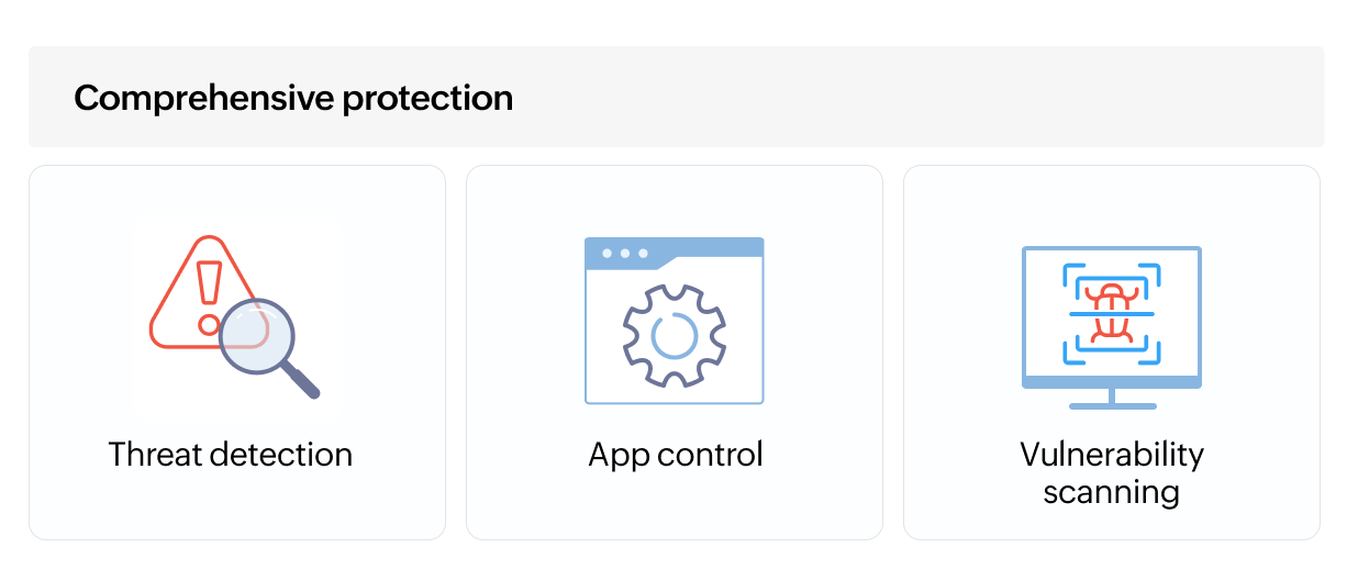Proactively defend with comprehensive protection, including real-time threat detection, application control, and encryption management, all managed from a single dashboard for seamless client security.