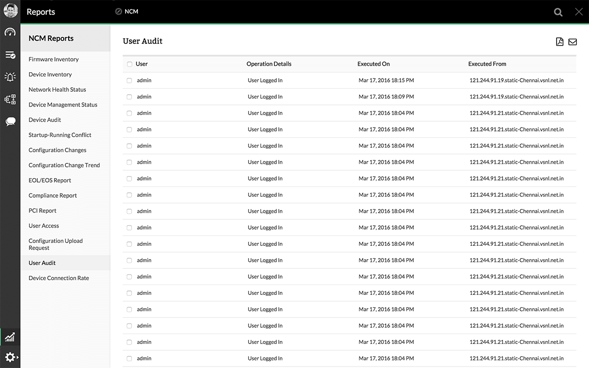 Users perform various operations on device configuration such as backing up the configuration, uploading configuration to device, enabling real-time change detection etc., When something goes wrong due to faulty configuration change or when a security breach occurs, it is important to trace user actions to ensure accountability in the organization. To ensure this, it is essential to record the information on who invoked what operation, on what device, at what time and the result of the operation. This is done by the Audit module of Network Configuration Manager and this is termed as "Device Operation Audit".