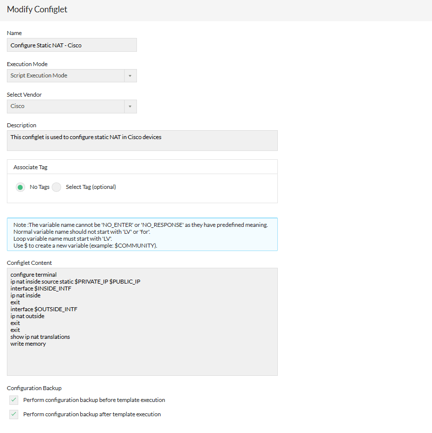 | Description | This configlet is used to configure static NAT in Cisco devices. |