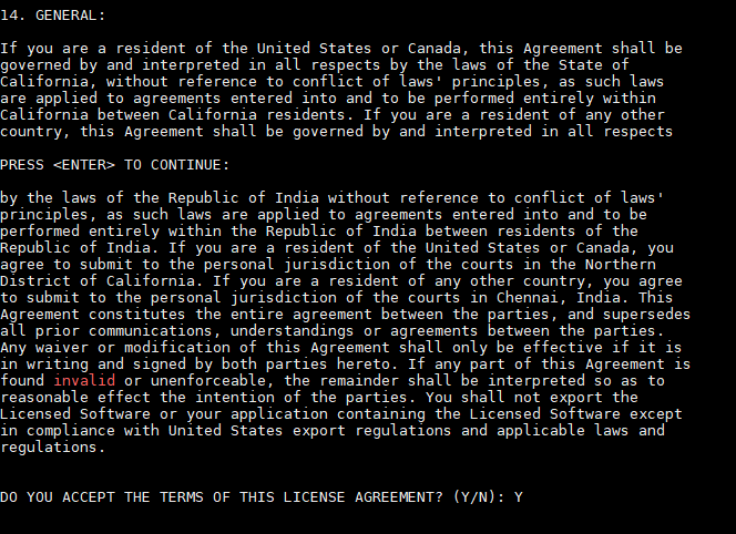 Step 2: Go through the license agreement and enter 'Y' to proceed.