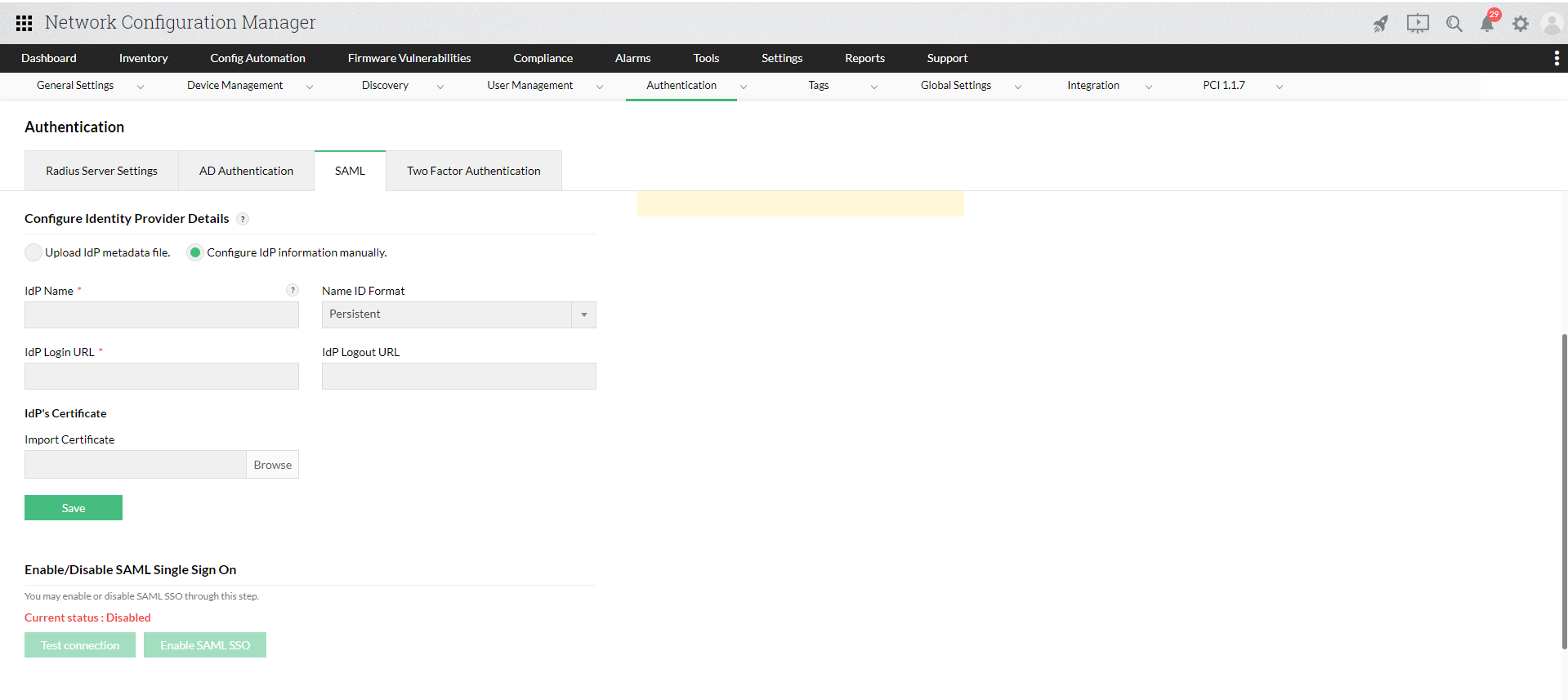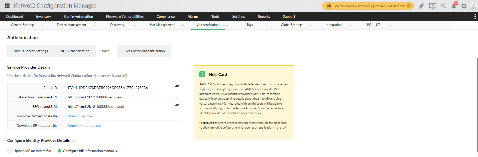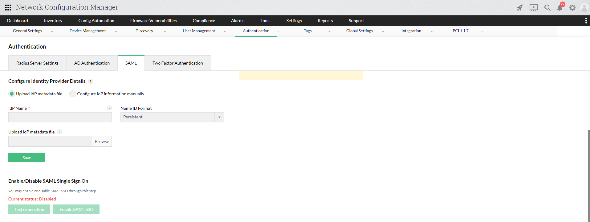 There are two ways to configure SAML in Network Configuration Manager. You can either do it manually by providing the necessary credentials or you can upload the metadata file directly, if available.