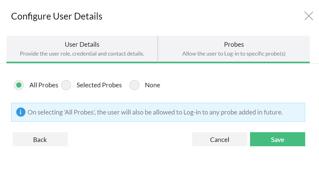 By assigning scope for the users, you can choose to allow/restrict the user to Log-in to specific probe(s).