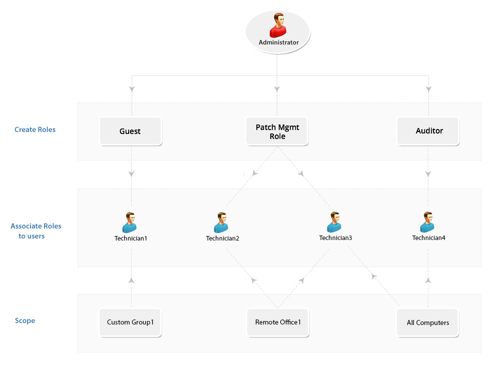 As an administrator, many a time you would have felt mundane routines spill over crucial attention-seeking jobs of your network. Patch Manager Plus answers this concern through its User & Role Management module; delegating routine activities to chosen users with well-defined permission levels. You can easily administer the users, and define their scope to manage a specific set of computers.