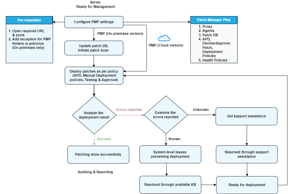 The workflow diagram below summarizes the entire patch management process using Patch Manager Plus. For further information, you can browse through the Related Links section.