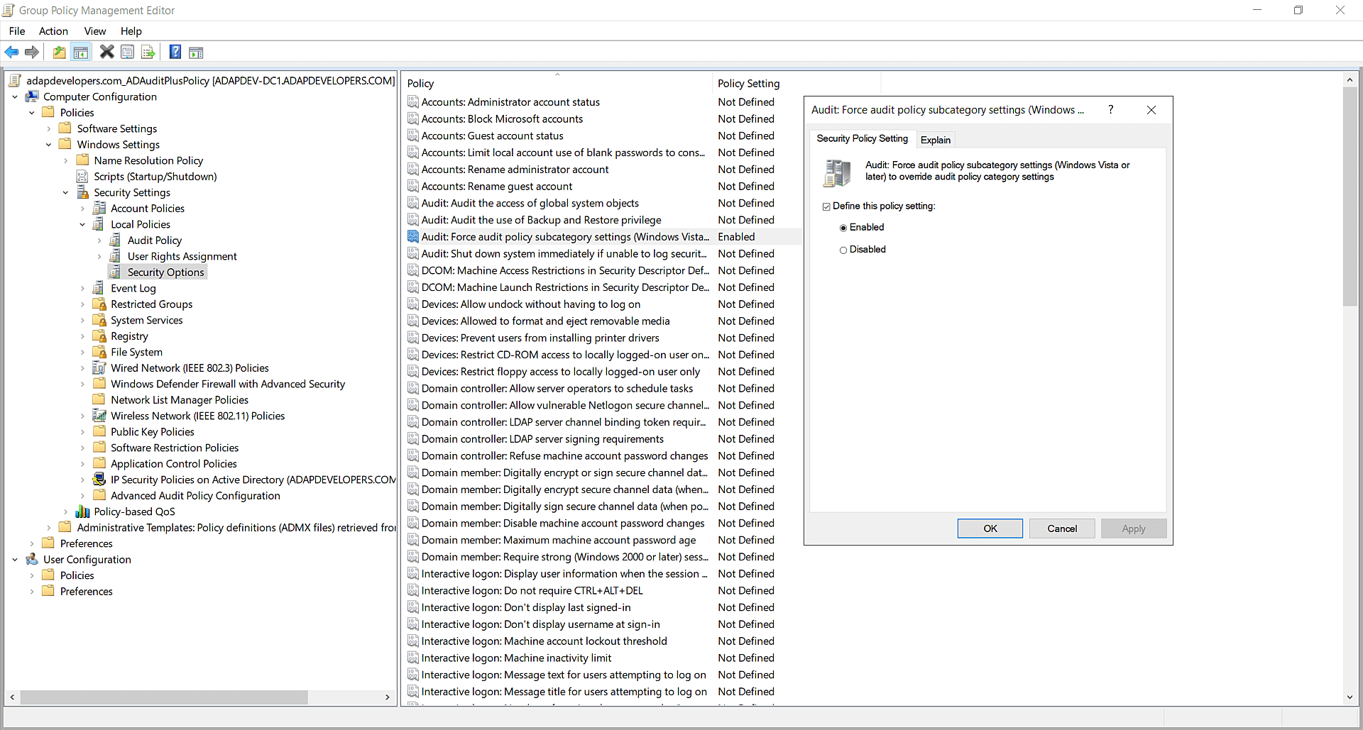 After configuring the advanced audit policies, ensure that they are forced over legacy audit policies.