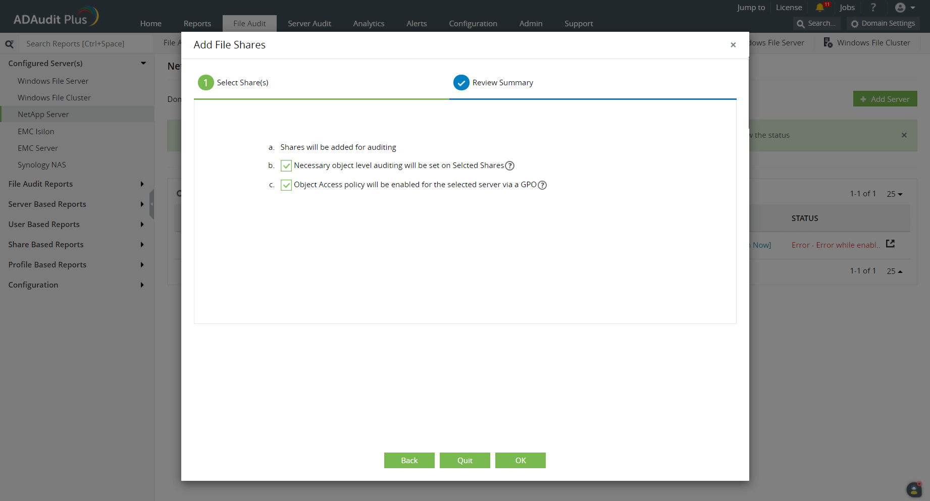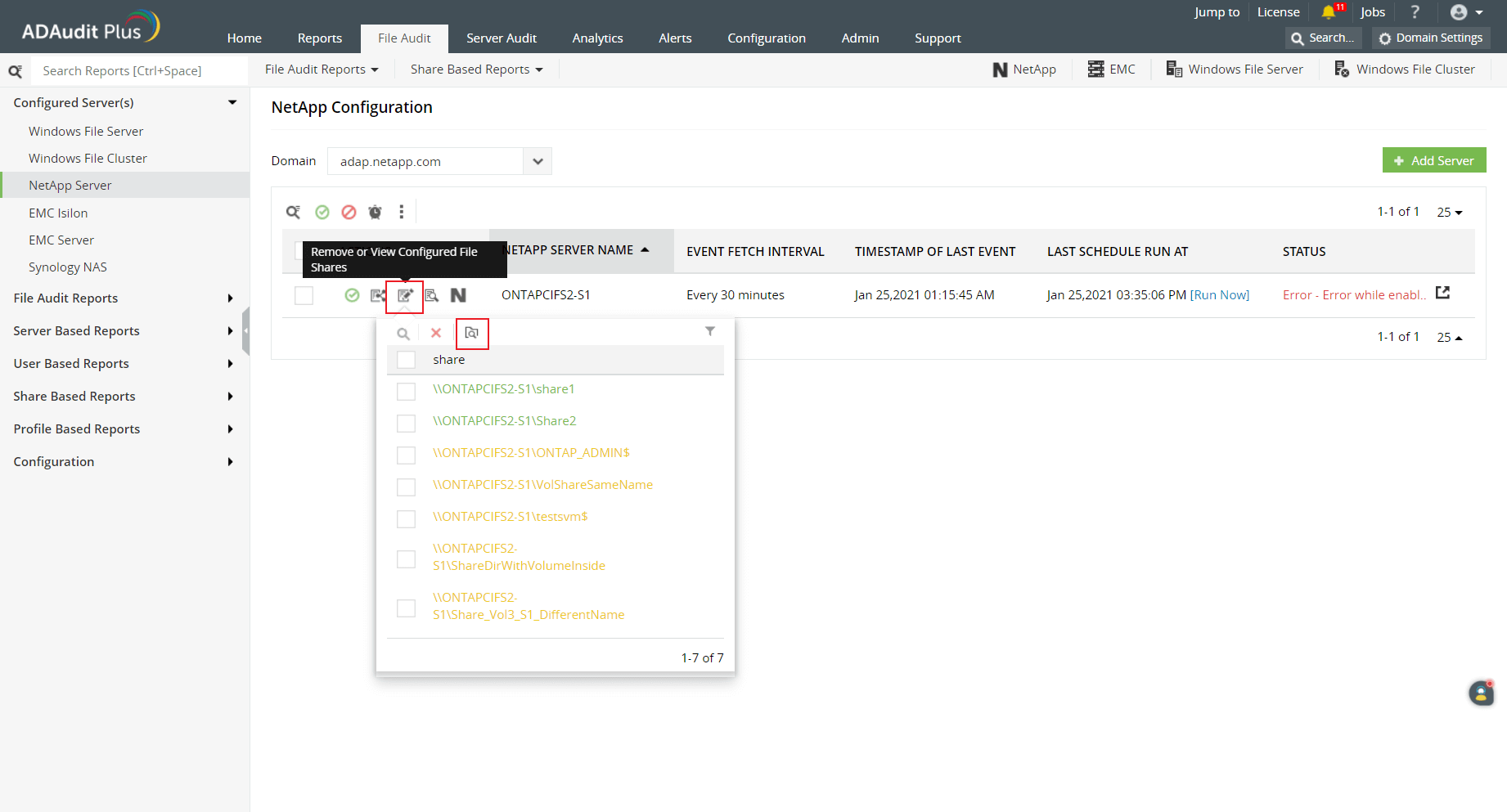 When the Remove or View Configured File Shares pop-up is opened, the available shares will be highlighted in one of these colors based on the status of the object-level auditing configuration: