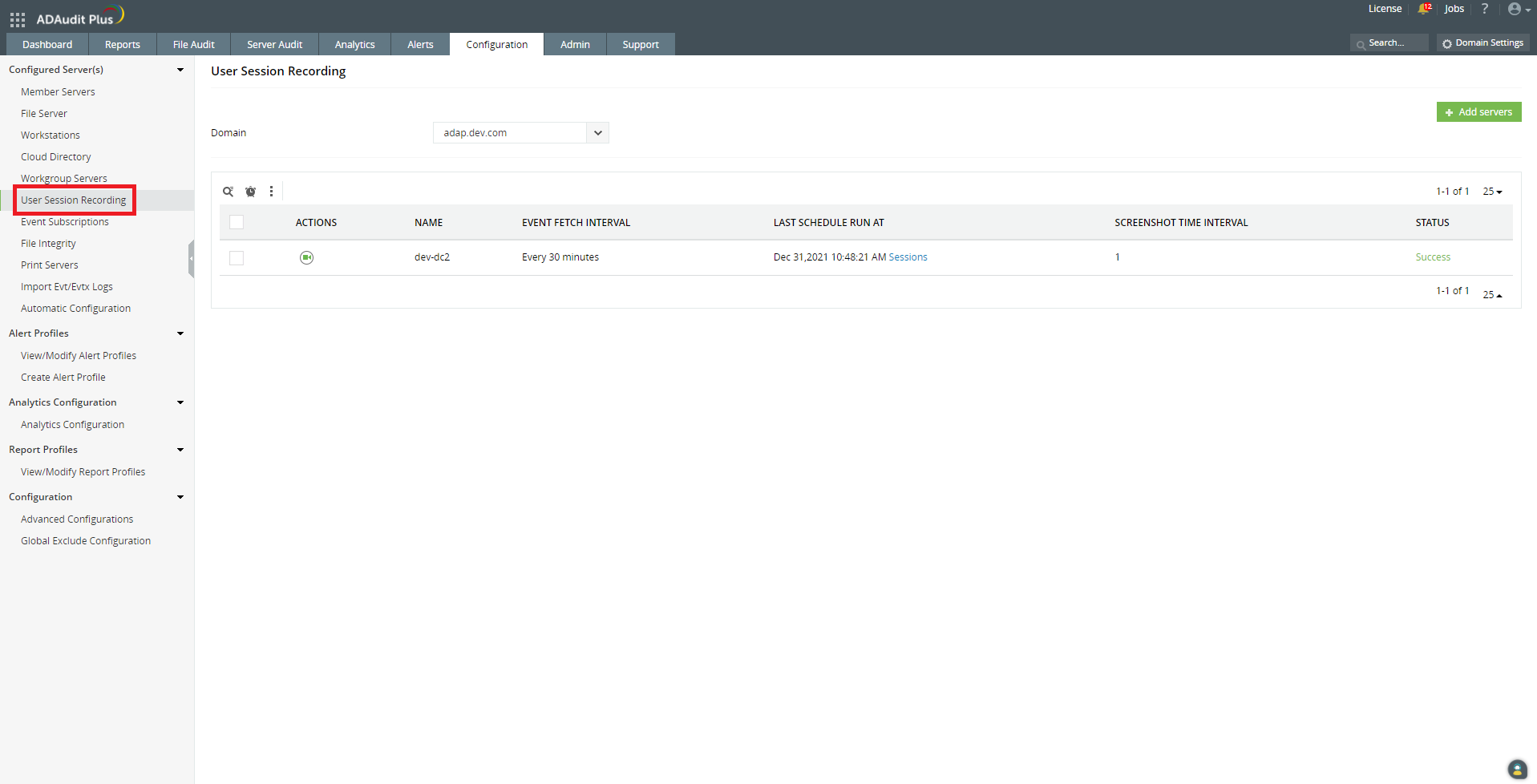 Login to ADAudit Plus > Server Audit > Configured Server > User Session Recording > Add Servers > Enter the required details to complete the configuration.