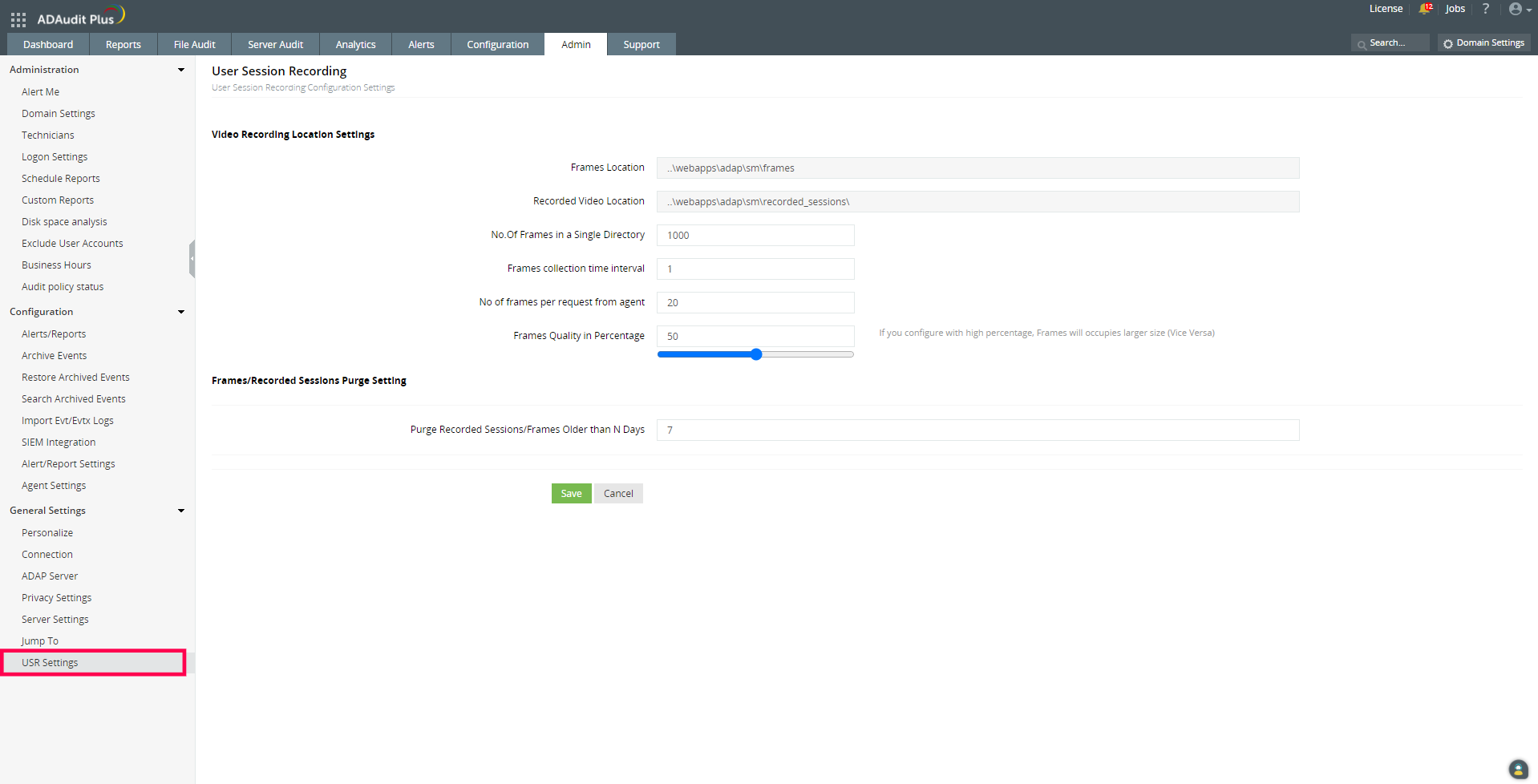 Login to ADAudit Plus > Admin > User Session Recording settings > Change the required settings.