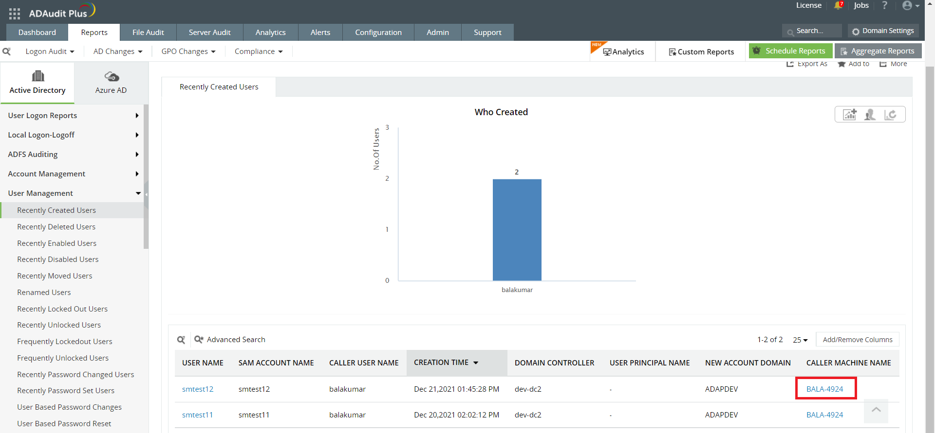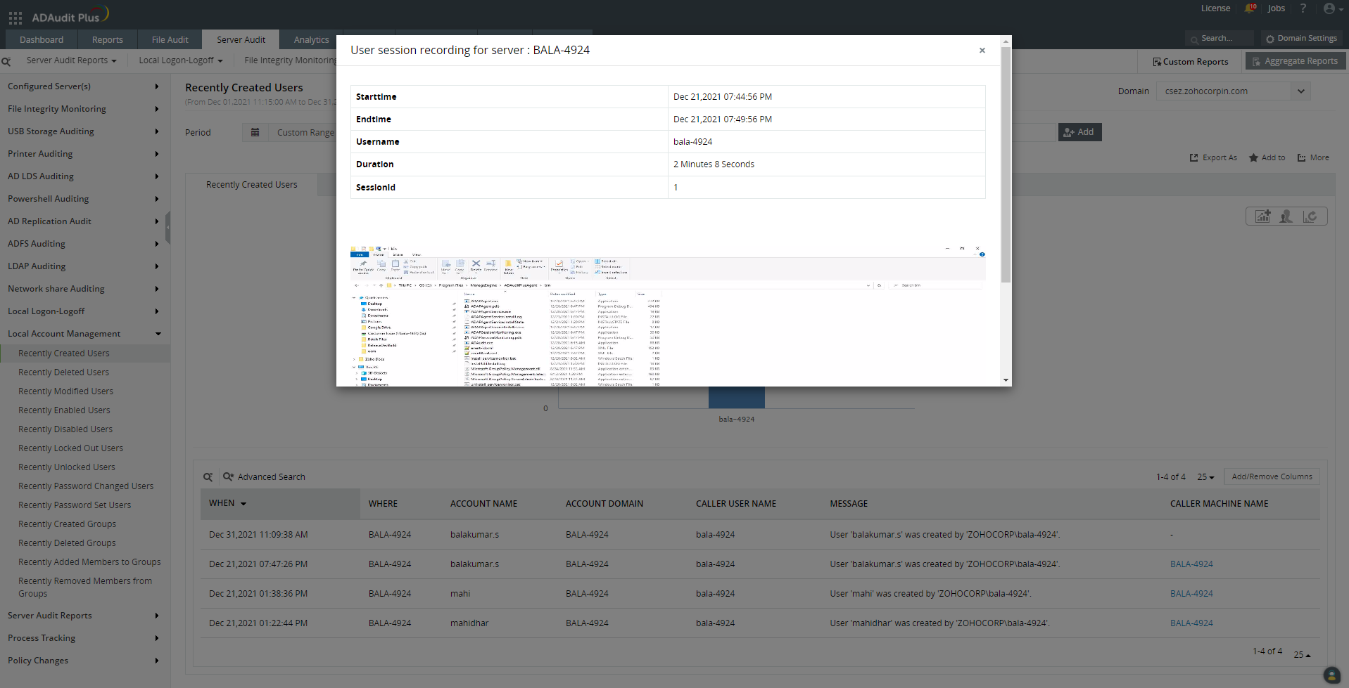 Login to ADAudit Plus > Click on any report > Click the hyperlink under the Caller Machine Name column in the table to view the relevant user session recording report.