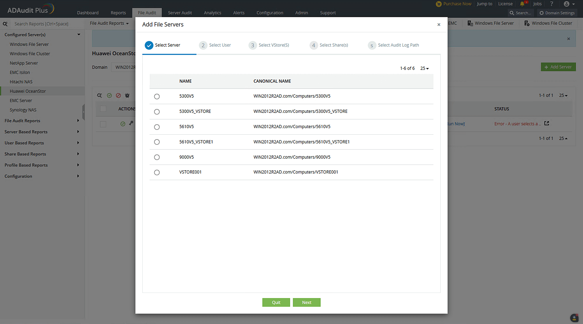 If no vStores are listed, or if only the system or default vStores are listed, check that the ADAudit Plus Huawei user has the required minimum privileges. If the issue persists after the privileges have been assigned correctly, contact the support team at support@adauditplus.com for further assistance.