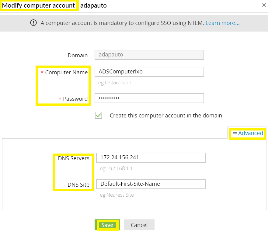 7. Under Advanced, if the DNS Servers and DNS Site are not filled automatically after entering the computer name and password, enter them manually.