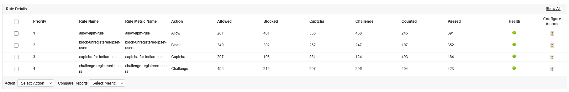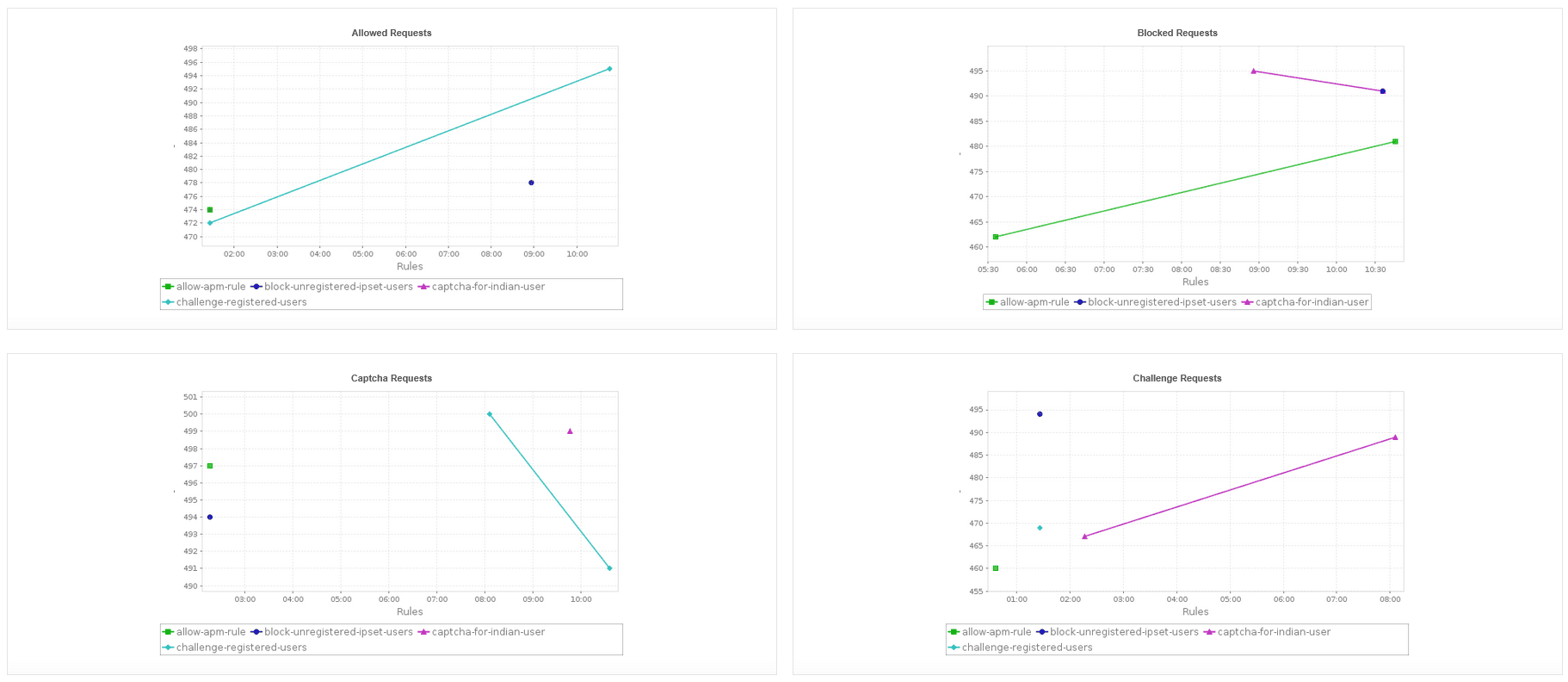 - Monitor rule-specific request actions to analyze how often specific rules are triggered. This helps detect and mitigate threats by identifying abnormal traffic patterns, reducing false positives, and optimizing rule performance.Tracking rule-based metrics allows for fine-tuning security policies and improving overall WAF efficiency.