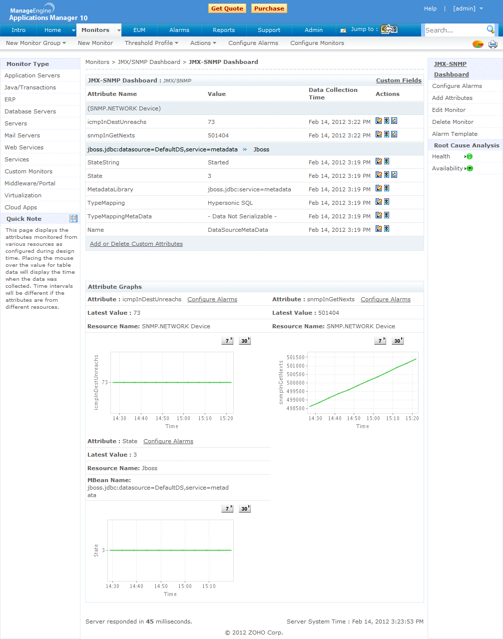 Support for executing JMX MBean Operations and custom scripts help administrators to take corrective actions when the application becomes critical. Out-of-the-box reports help provide the added trending information to manage your application efficiently.