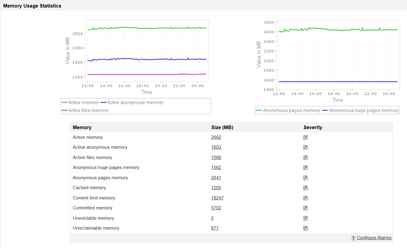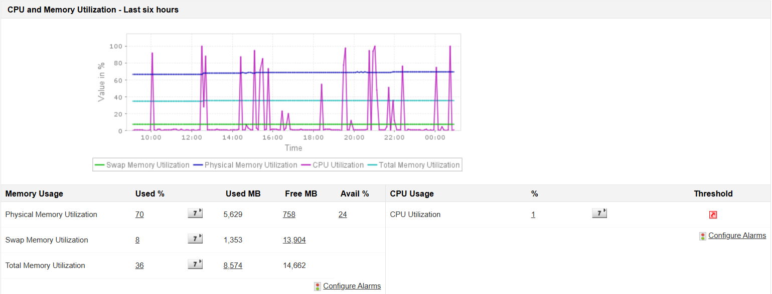 Applications Manager's Linux performance monitoring tool extensively shows CPU utilization with the break up of individual core utilization and their status. Keep an eye on critical attributes such as run queue, blocked processes, user time (%), system time (%), I/O wait time (%), Idle time (%), and Interrupts/sec. Allocate and manage CPU resources to avoid performance bottlenecks.