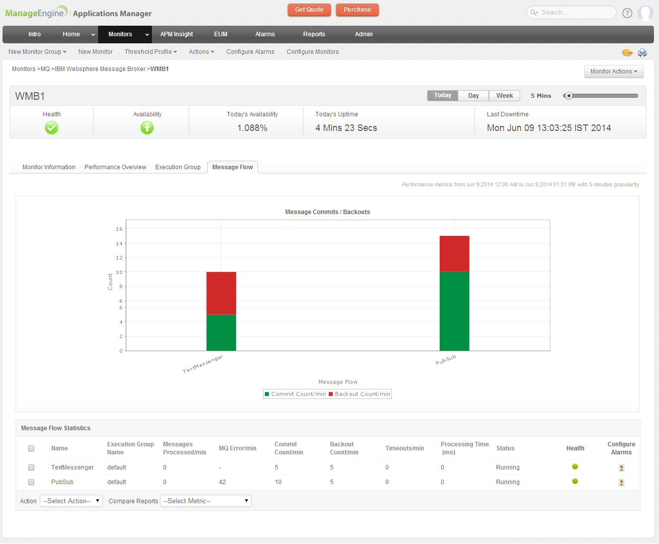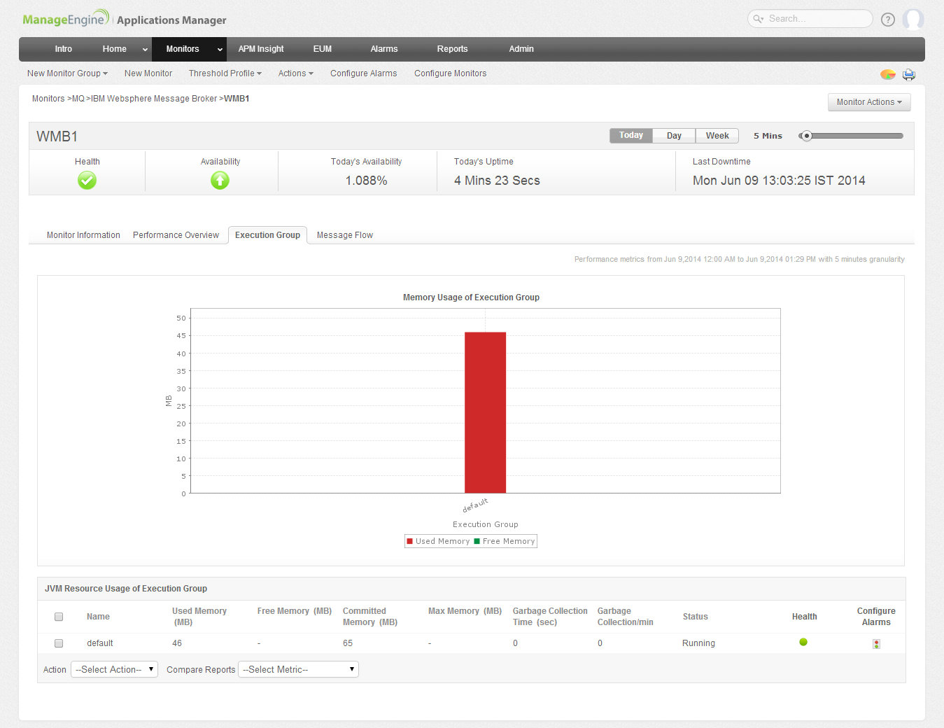 Applications Manager monitors availability and performance of the Message Broker, execution group and message flow and memory usage of the execution group. Resolve incidents before they become an issue, enjoy improved service levels and reduced risk of downtime within your IBM MQ infrastructure. You can also collect Message Flow Accounting and Resource Statistics and configure thresholds to the attributes monitored by the server based on these details. The monitoring details of IBM Integration Bus are represented graphically that helps to understand the parameters with ease.