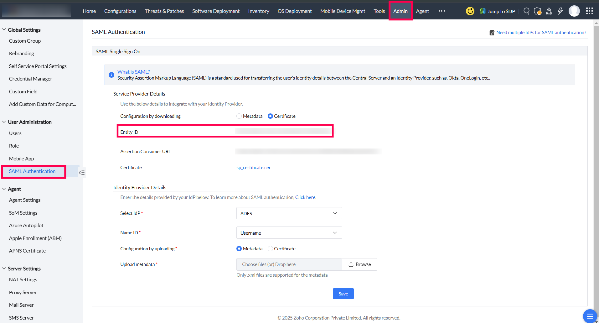 Again inCentral Server, navigate toAdmintab and selectSAML Authentication. ChooseCertificate against Configurationby downloading. CopyEntity ID.