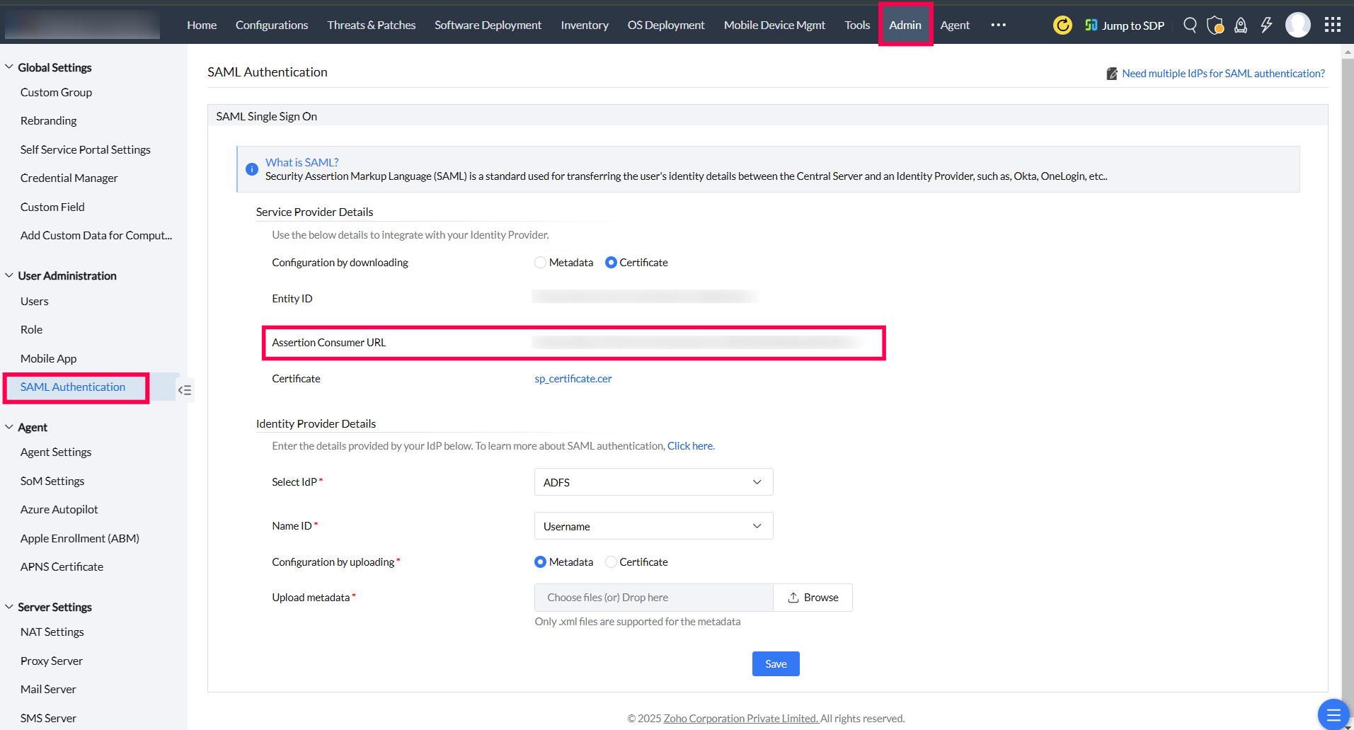 In Central Server, navigate to Admintab and select SAML Authentication. Choose Certificate against Configuration by downloading. Copy the Assertion Consumer URL.