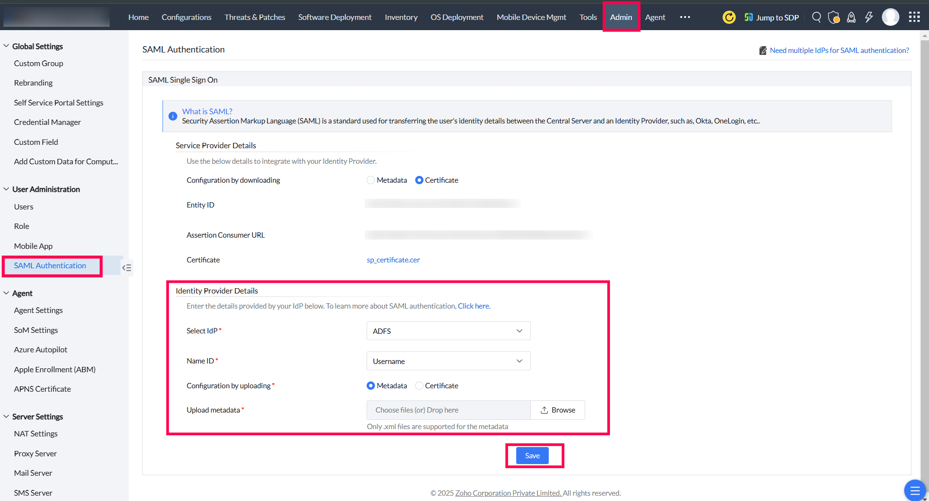In theCentral Server console, navigate to Admin->SAML Authentication. Here, select the IdP as ADFS and choose the Name IDasUsername. Beside Configuration by uploading, choose Metadata and upload the Metadata XML file. Click on Save.