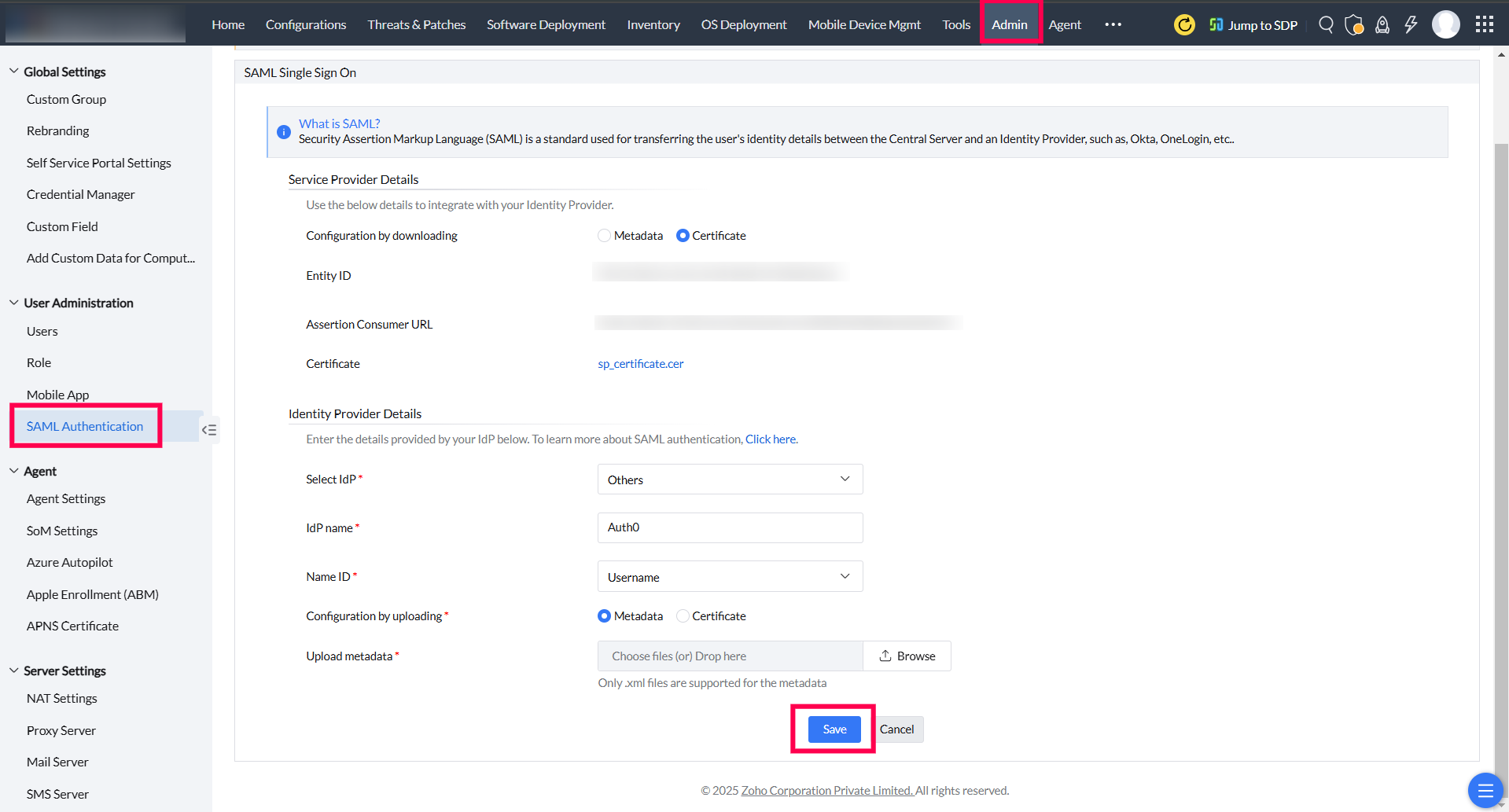9. In Central Server, choose Others against Select IdP. Fill in IdP name as Auth0. Select Username as Name ID. After that, choose Metadata against Configuration by uploading. Now, browse and upload the Metadata file. Click on Save.
