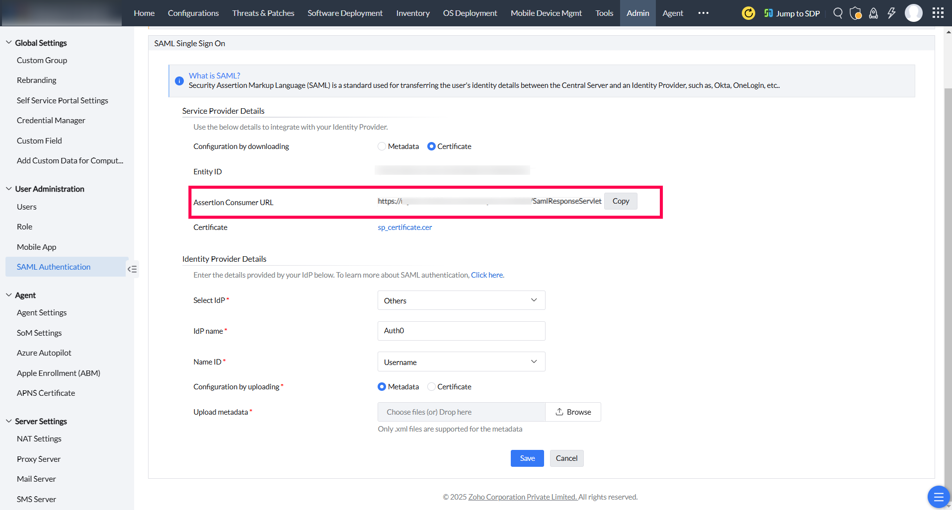 3. Open Central Server web console. Navigate to Admin tab, click on SAML Authentication. Choose configuration by downloading as Certificate. Copy the Assertion Consumer URL. Navigate to Admin tab, click on SAML Authentication.