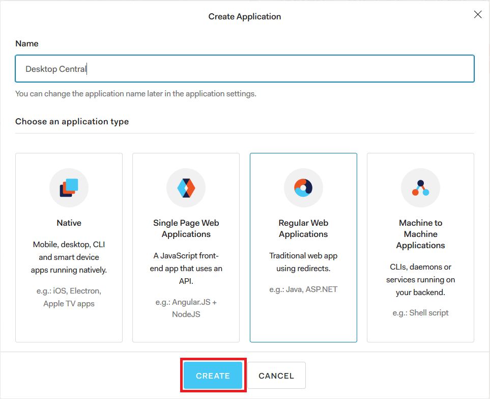2. Type Central Server as application's name. Select the application type as Regular Web Applications. After that, click on Create.