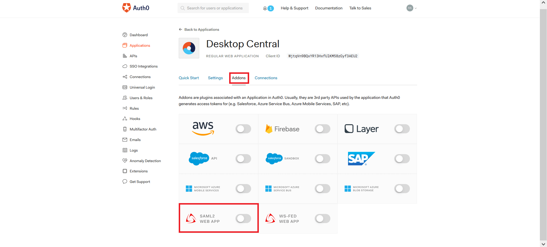 4. In the Auth0 page, navigate to Addons tab. Enable SAML2 WEB APP option.