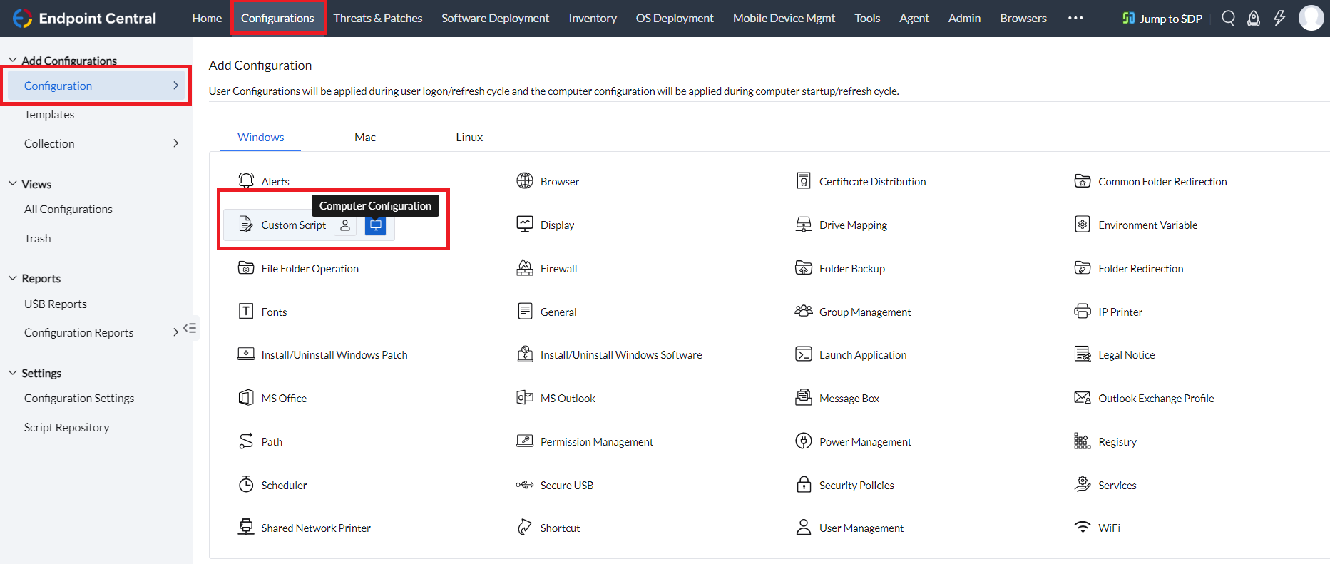 - In the Endpoint Central console, navigate to Configurations > Add Configurations > Windows Configuration > Custom Script > Computer Configuration.