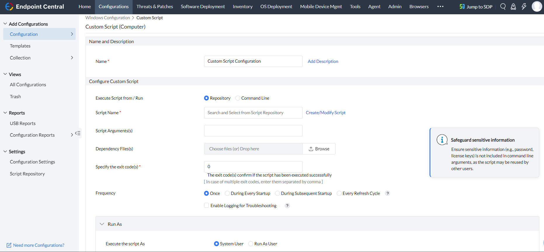 In Endpoint Central, scripts must be added to the Script Repository before being deployed to end-machines. You can choose from the predefined script templates or add your own scripts to the repository.