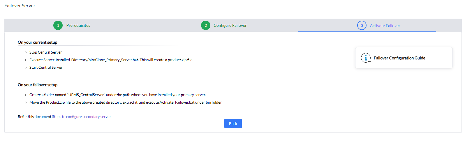 Note: You do not need to manually install the Endpoint Central EXE on the failover server machine. Simply download the above mentioned BAT file and execute it to configure the failover server.