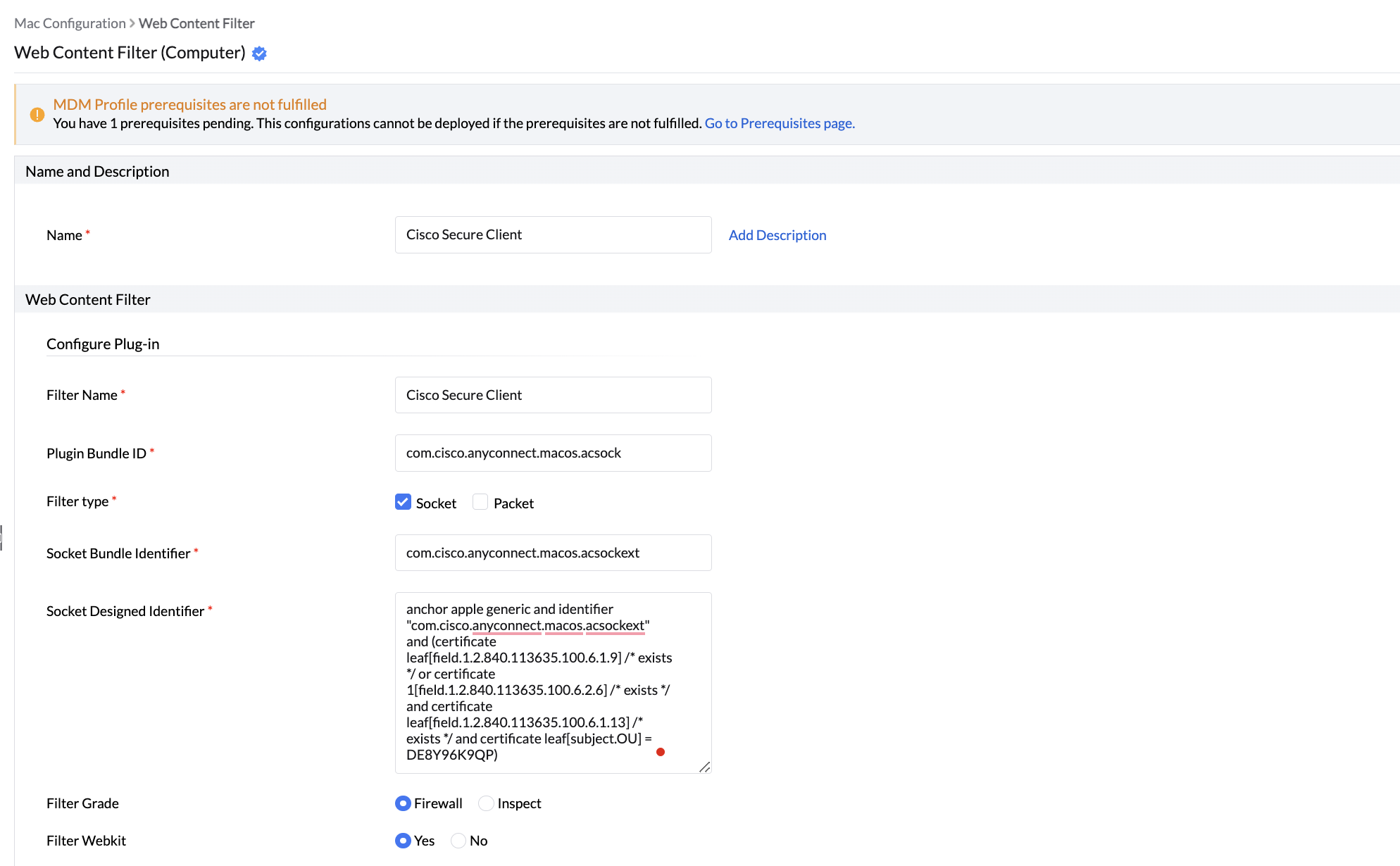 5. Provide the Socket Filter Bundle Identifier as (For example : com.cisco.anyconnect.macos.acsockext)