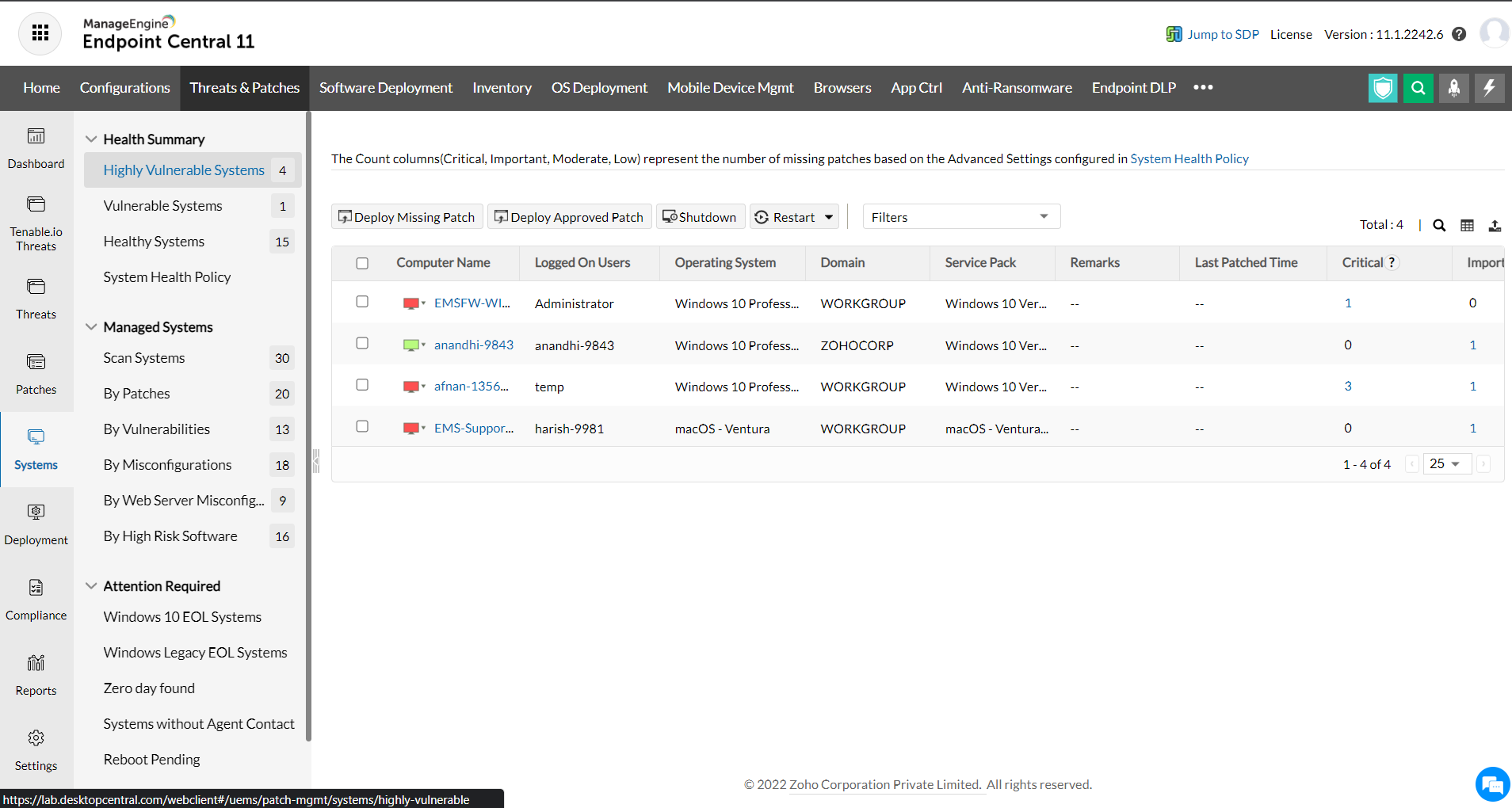 To view the details on Highly Vulnerable Systems, follow the steps mentioned below: