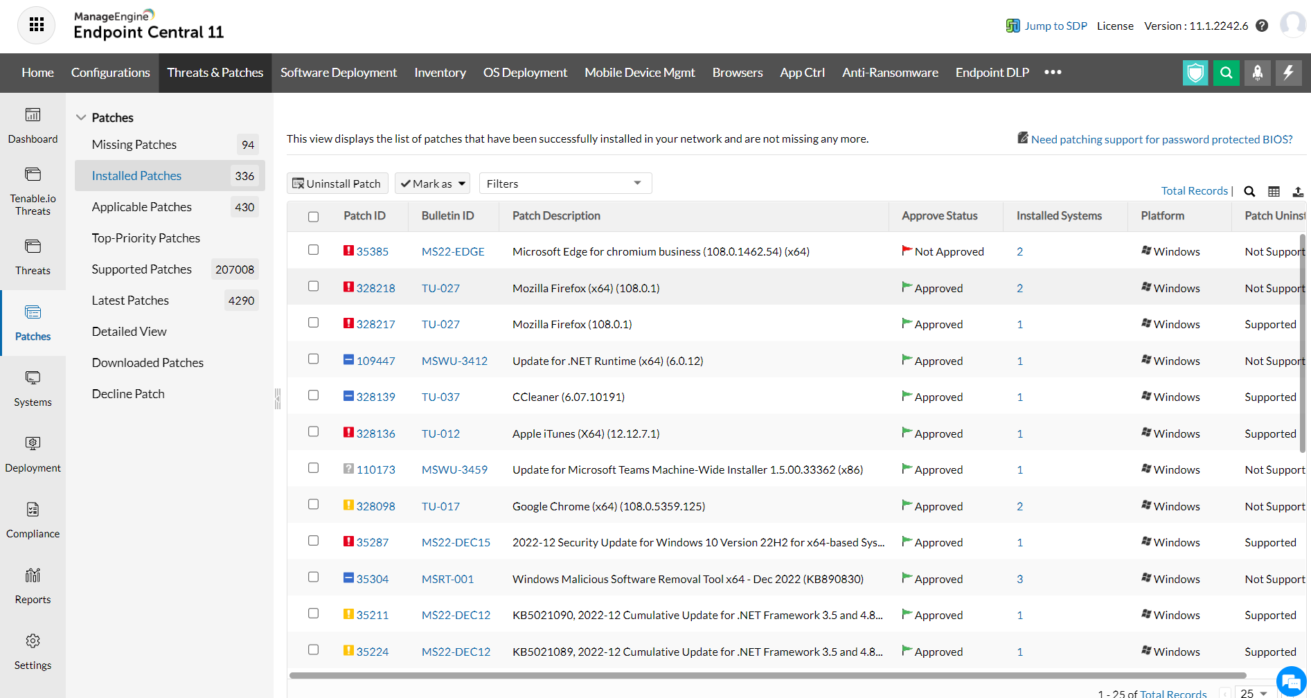 The Installed Patches view provides the details of the patches that are installed in your network.