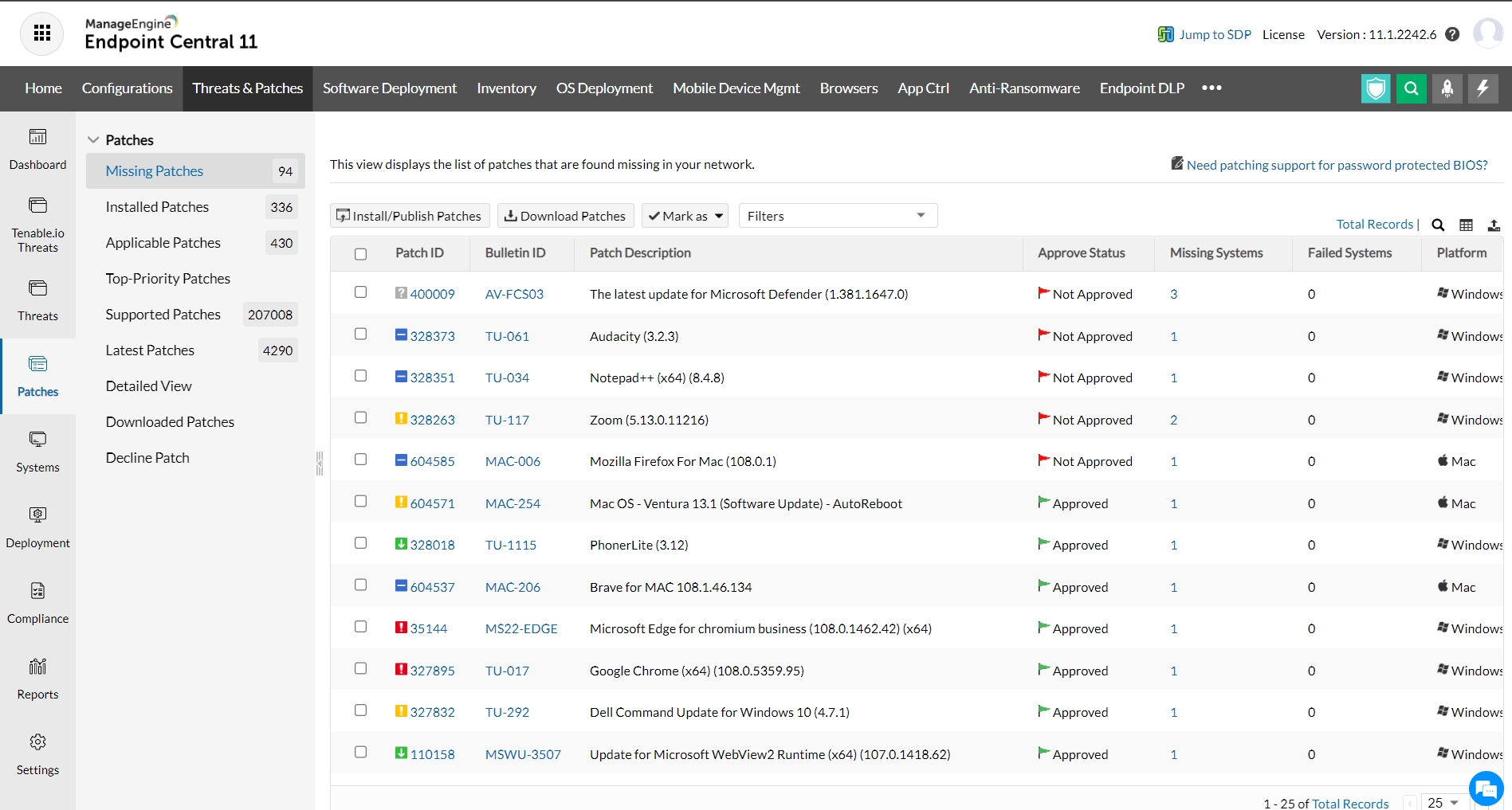 The Missing Patches view provides the details of the patches that affects the applications/ systems in your network, which are not installed.