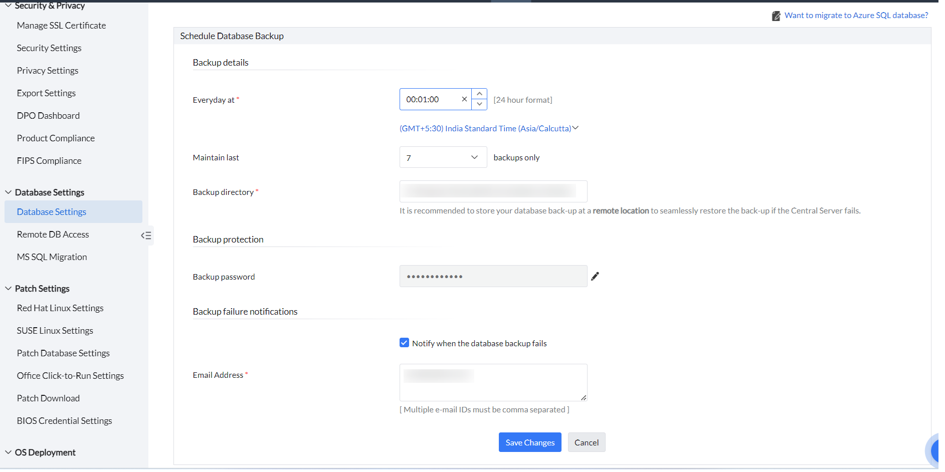 You can ensure that the scheduled database backups are secured by enforcing a password. Only the authenticated users will be allowed to access the backed up database.