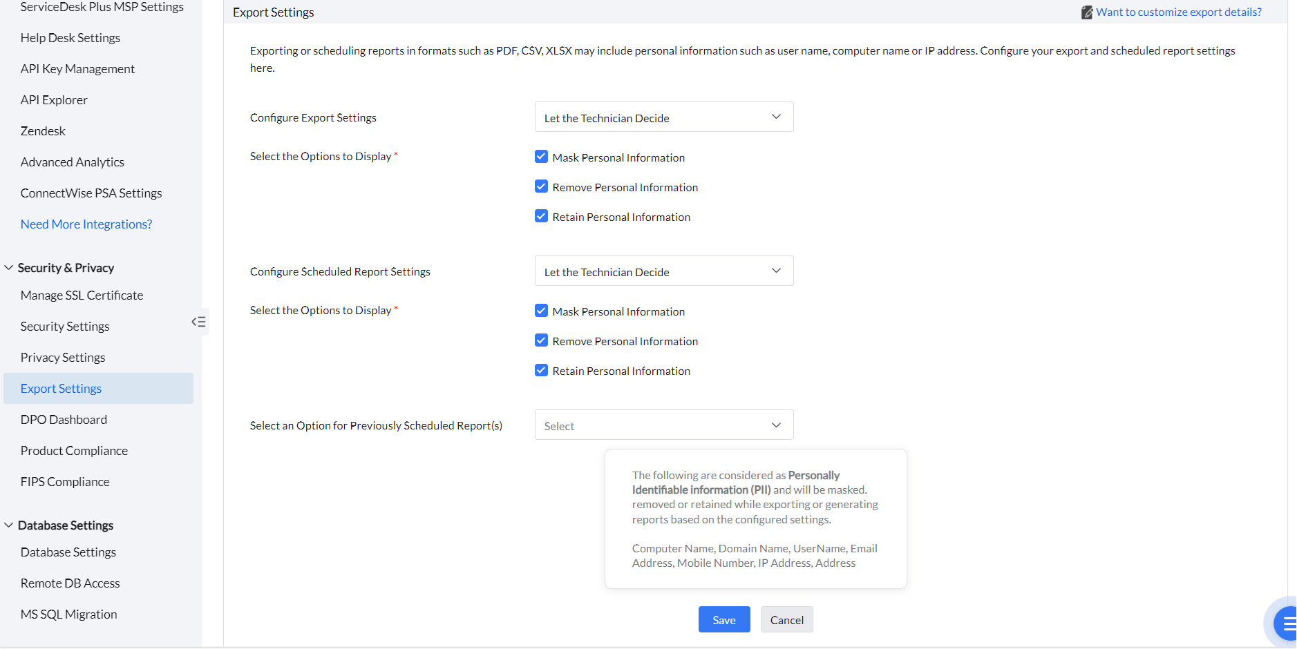 All the personal information such as name, domain name, IP address, etc., in scheduled or exported reports can be secured by configuring the export settings. You can set a default settings or let the technician generating / exporting report(s) decide. Find the export settings at Admin tab -> Under Security Settings -> Export Settings.