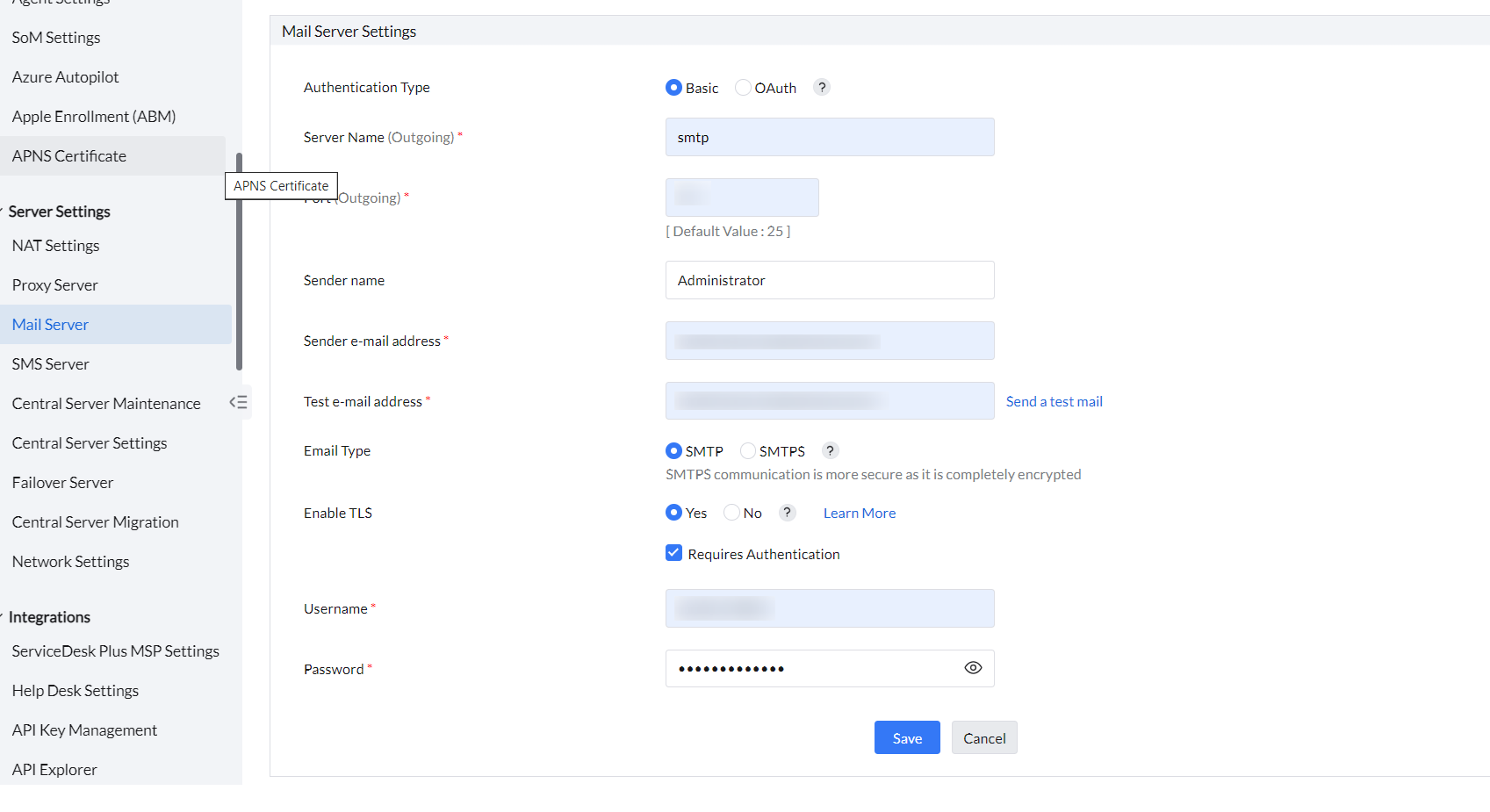 It is always recommended to secure your mail server communication, so ensure that you use SMTPS communication. You can configure it from: Console -> Admin -> Mail Server Settings.