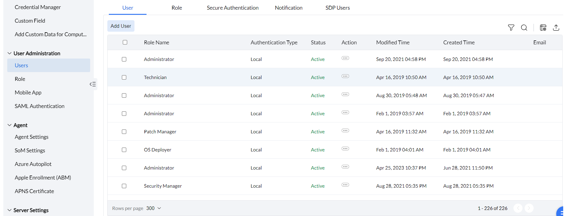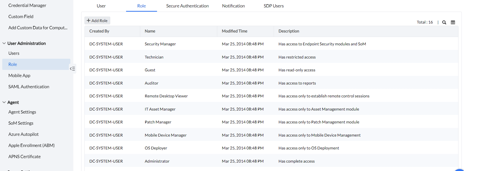 Defining specific roles and scope to technicians will limit the risks of unexpected data leakage. You can create separate roles and grant permissions to specific modules, define scope for the Endpoint Central users from Console -> Admin -> User Management -> Roles