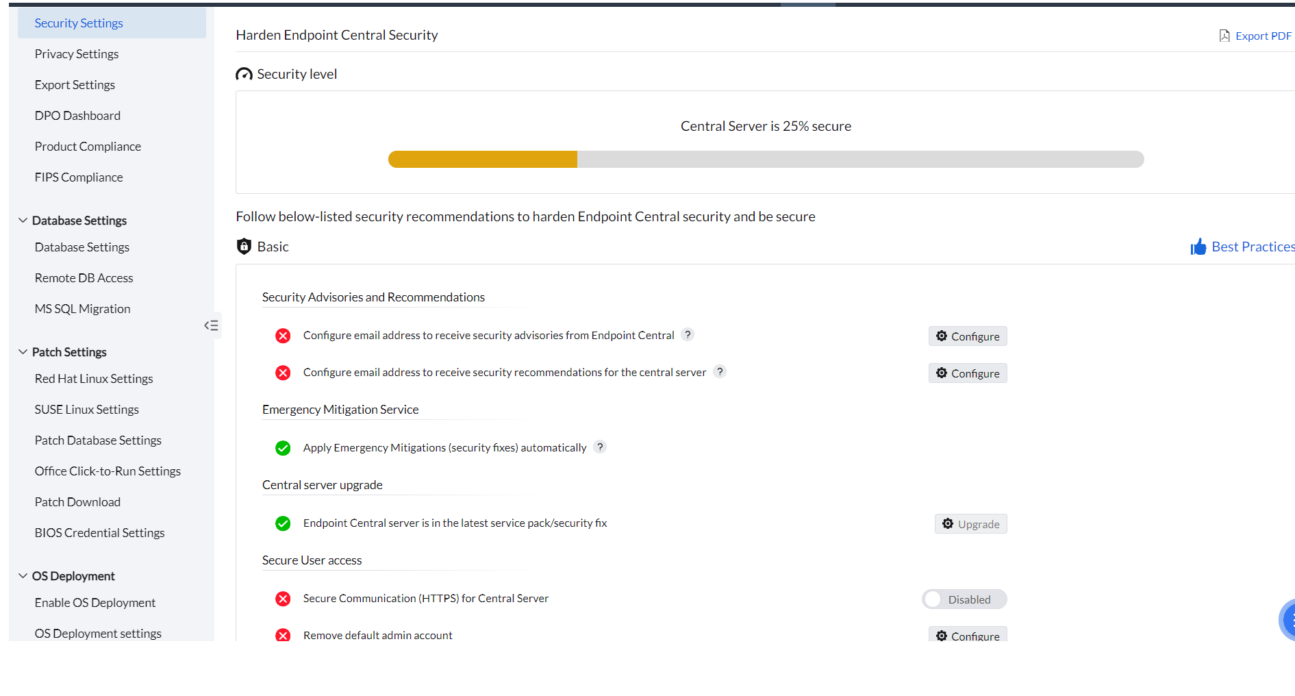 From Endpoint Central console, navigate to Admin tab -> Security Settings . This view lets you understand the security levels of your Endpoint Central server. It is always recommended to enable every given setting to keep your server security at optimized levels.