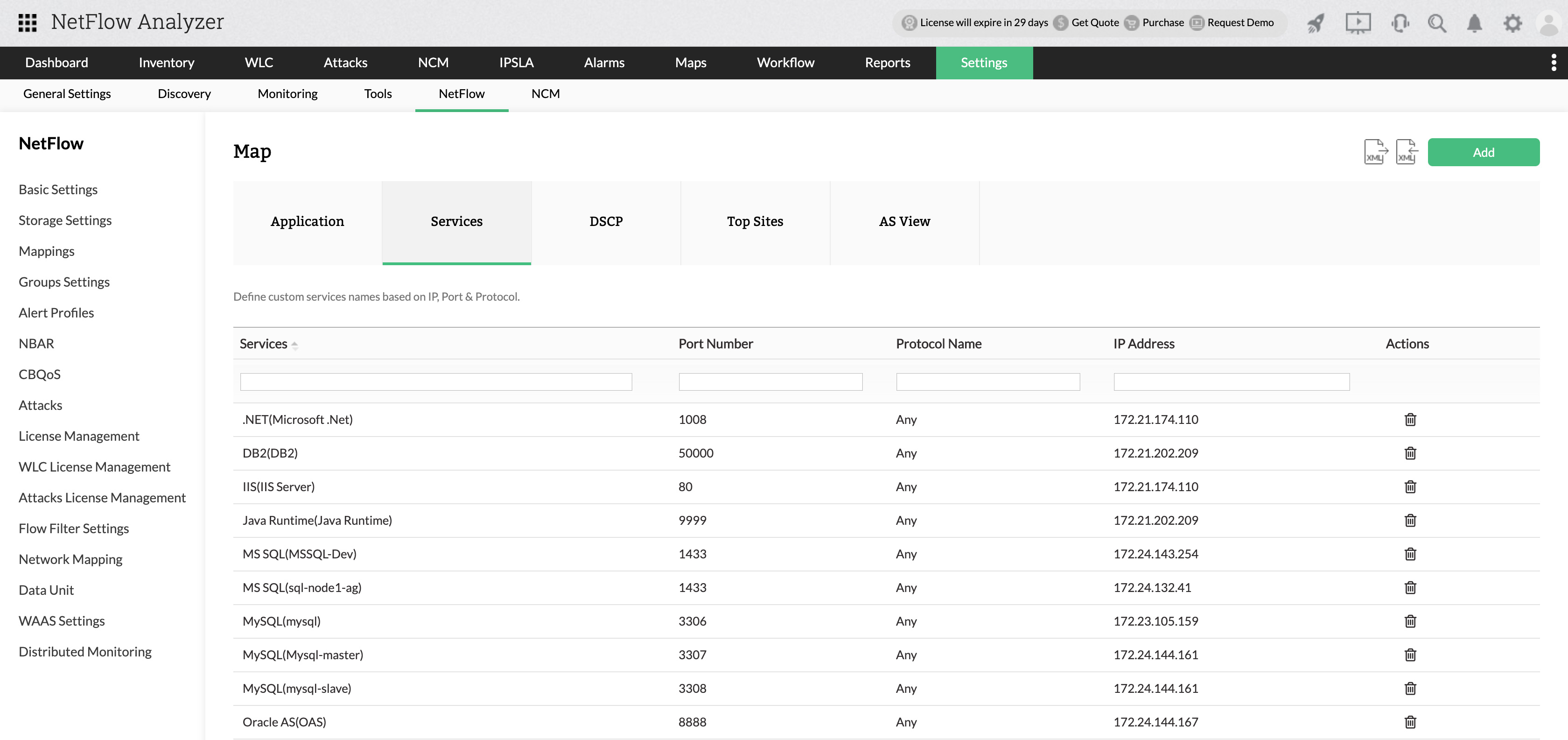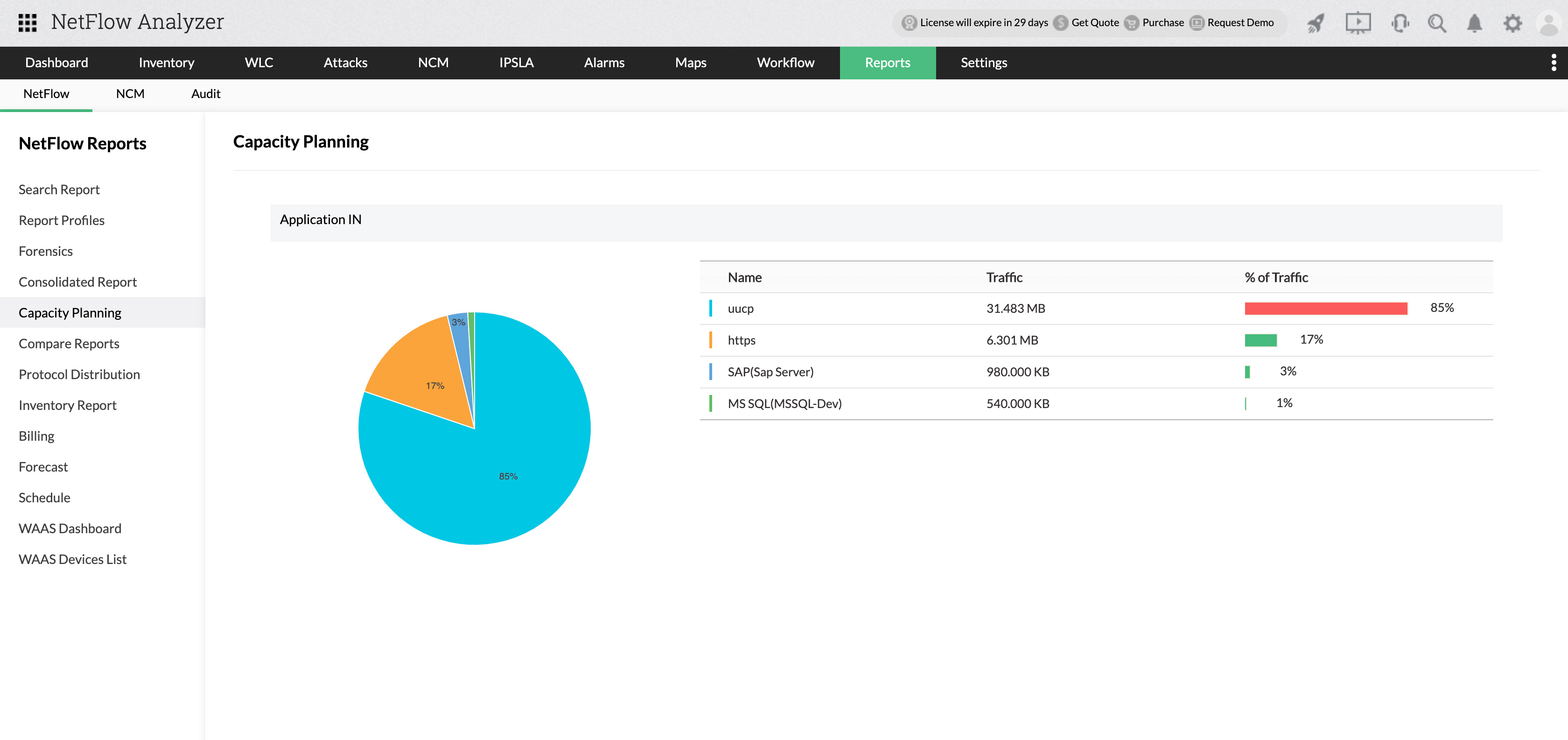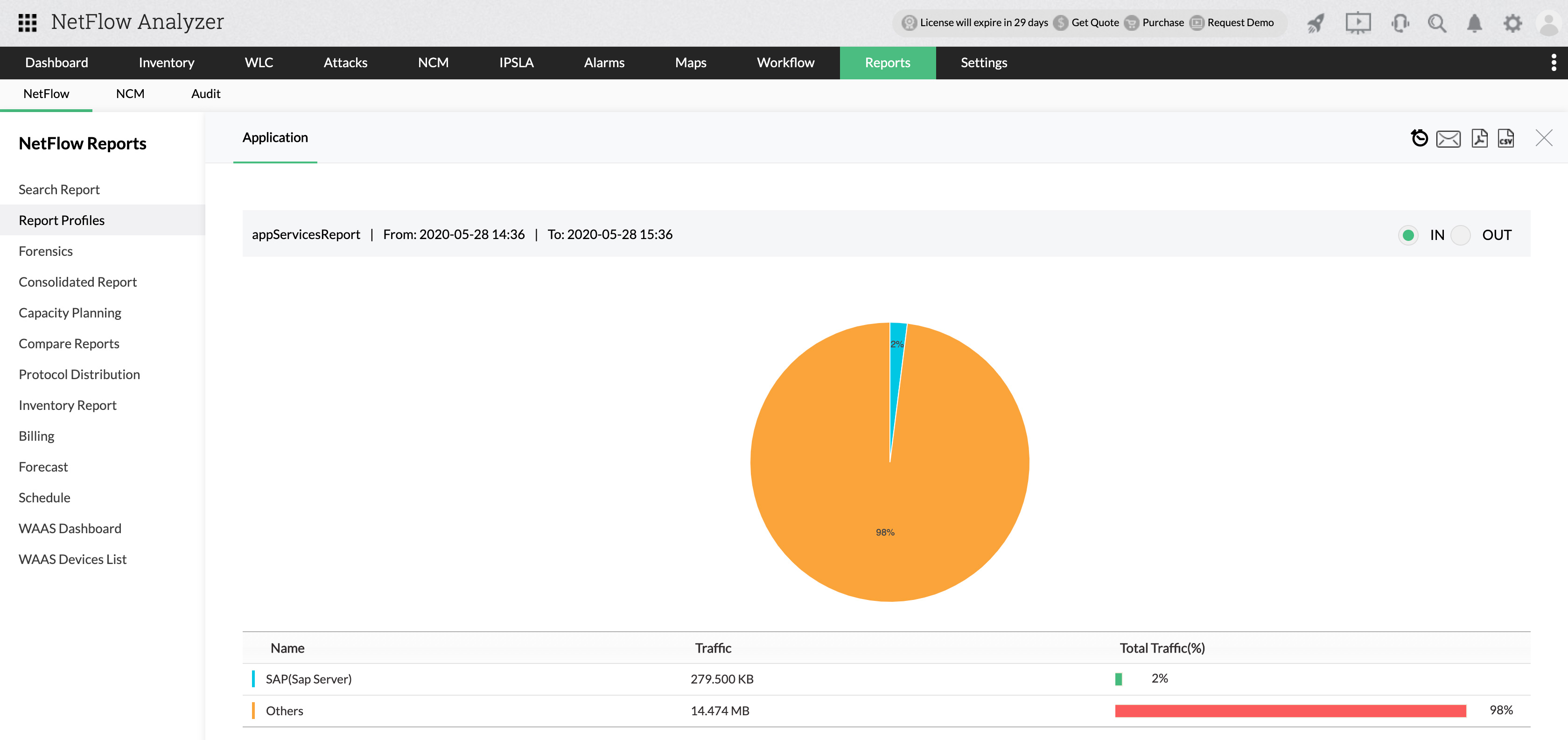 Generate detailed reports that include service port, protocol, and IP details, and analyze top applications and services, their utilization, traffic, and growth.