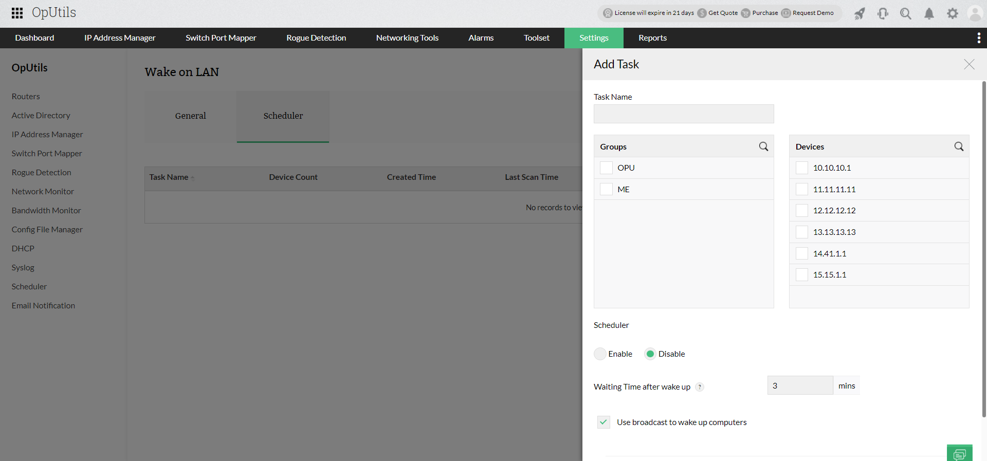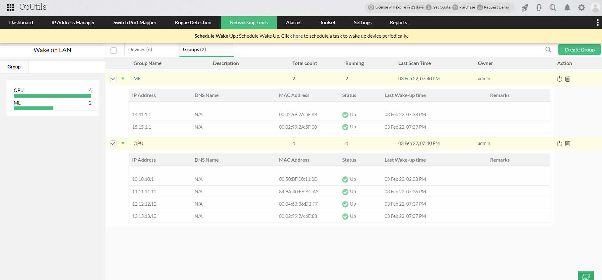 OpUtils’ Wake on LAN tool enables network admins to create multiple groups containing different computers, and these groups can be scheduled to run at different times. There is no restriction on the number of groups that can be created. The status of individual tasks will be provided as a summary under Groups in Networking Tools by the Wake on LAN tool. The status of individual computers will also be available in the Status column under Devices in Networking Tools.