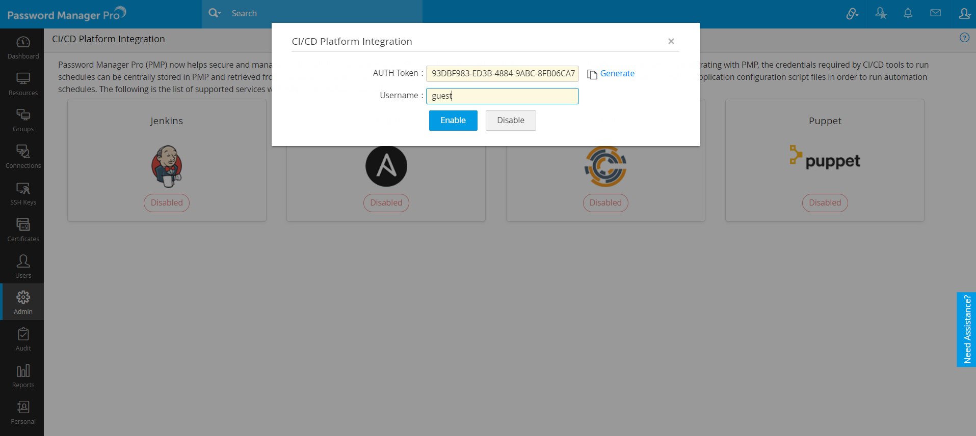 - In the CI/CD Platform Integration window, click Generate to populate an AUTH Token automatically. This will be required later while invoking the plugin in Puppet. Once set up, all incoming connections from Puppet will be validated by Password Manager Pro using this AUTH token.