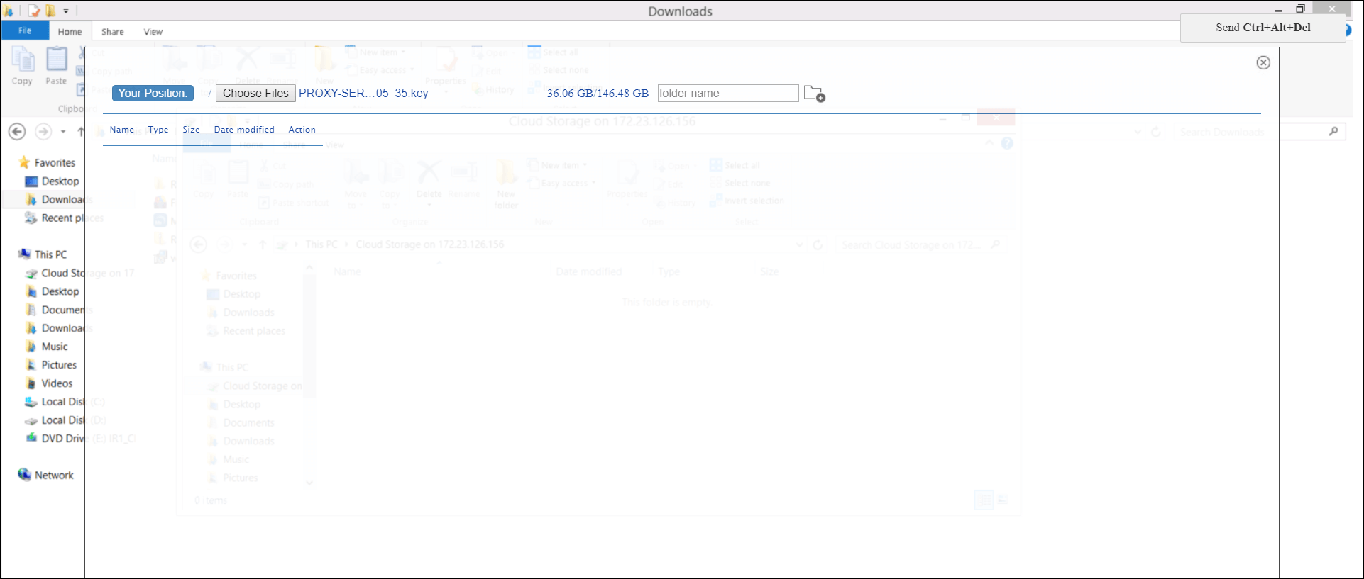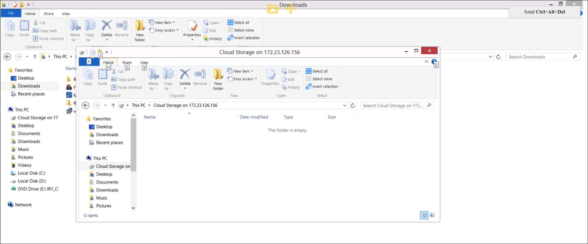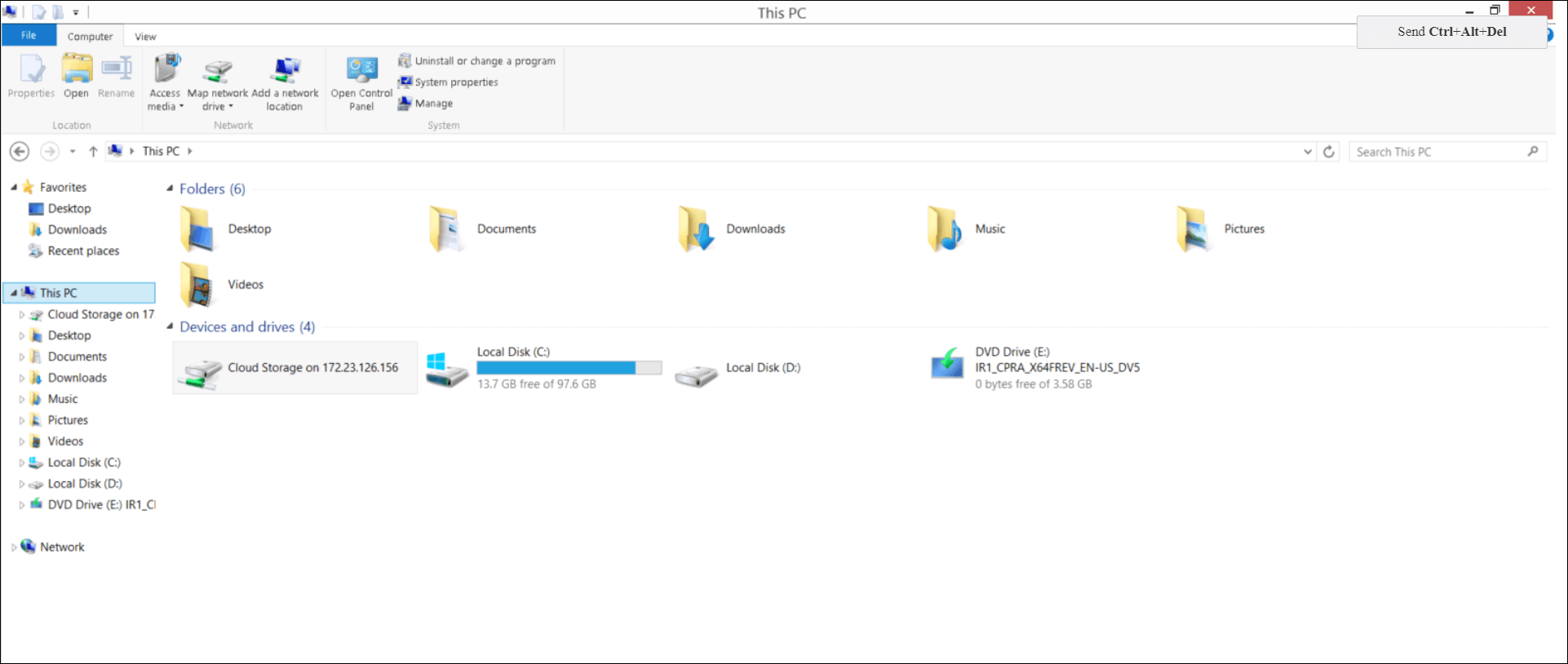 - Once the RDP console opens, go to the remote machine's My Computer folder and click the new drive named Cloud Storage on <IP address> here. This is the temporary folder that will enable you to transfer files to and from the remote machine.
